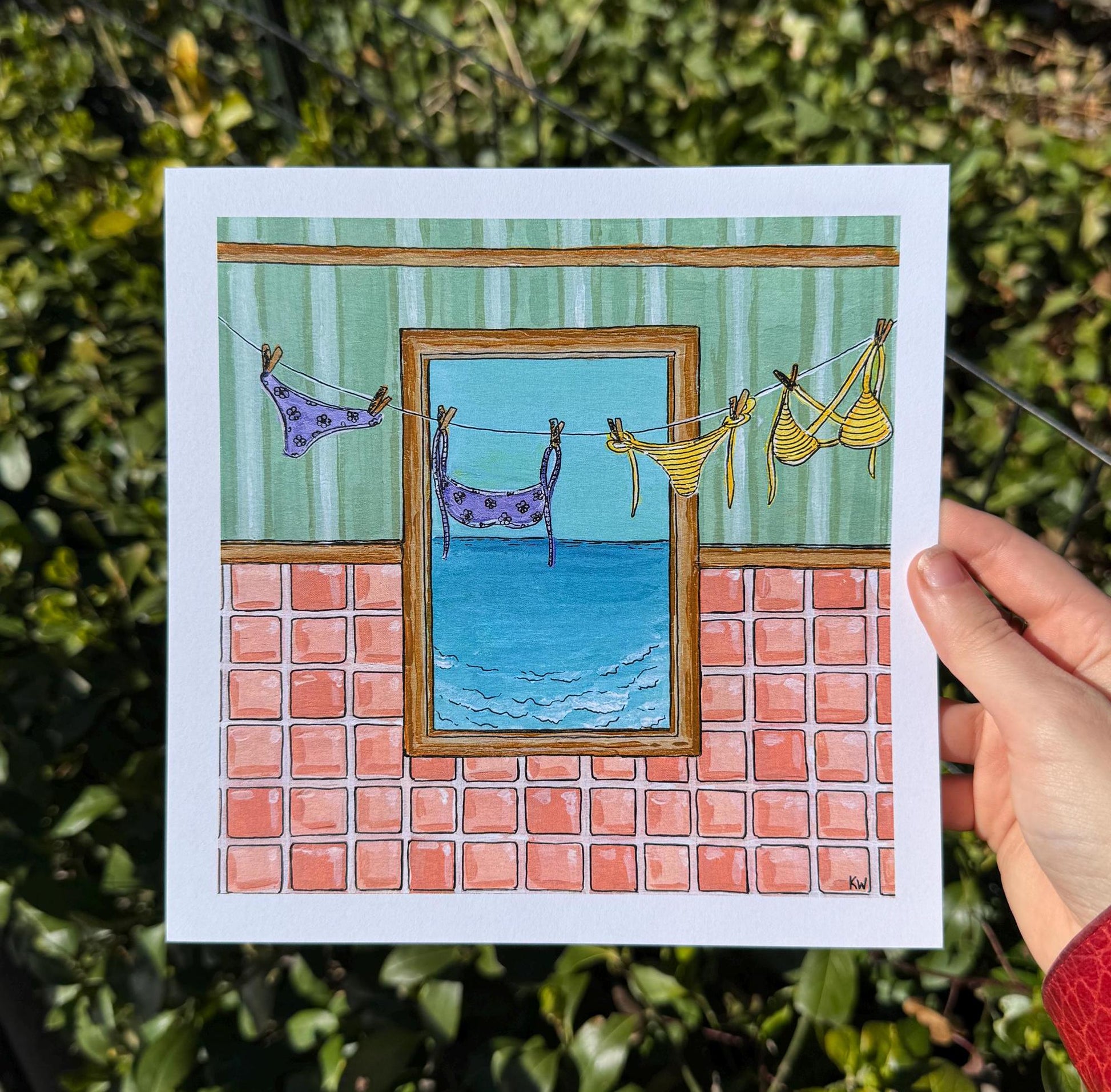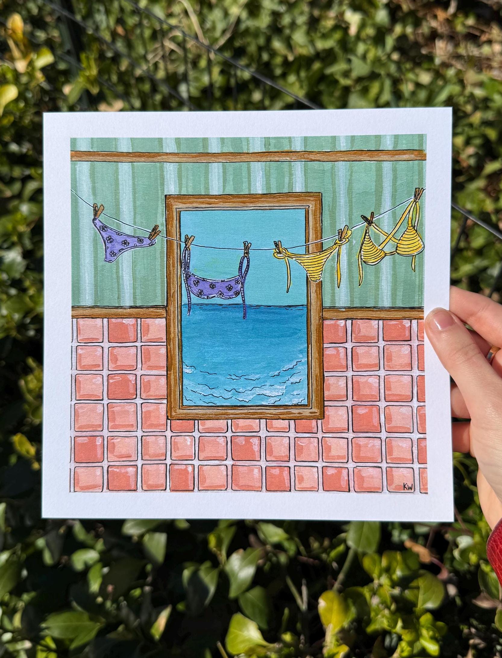 “Bikini Summer” is a playful 8x8-inch art print that brings sunny vibes and beachy nostalgia into any space. This original painted illustration captures a cozy interior scene featuring swimsuits drying on a clothesline in front of a breezy ocean view.