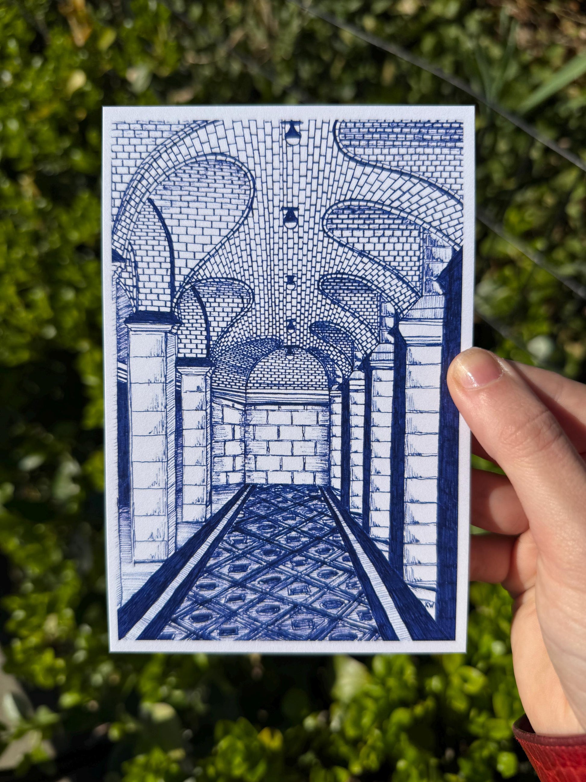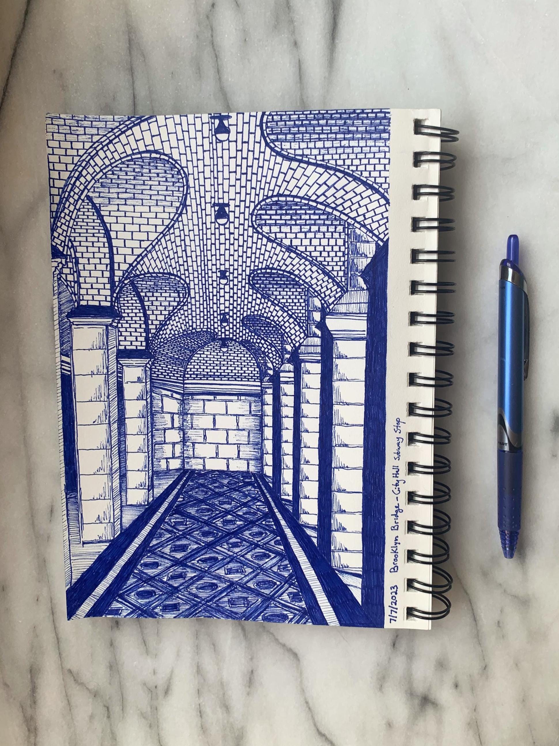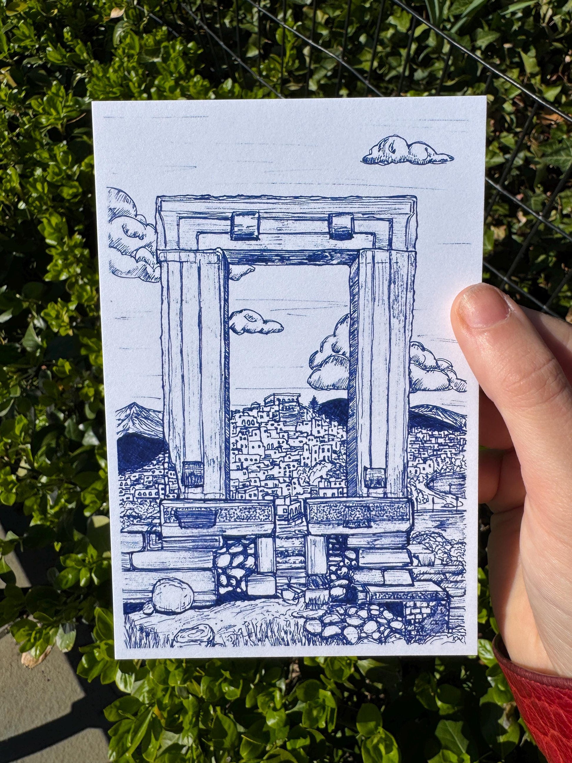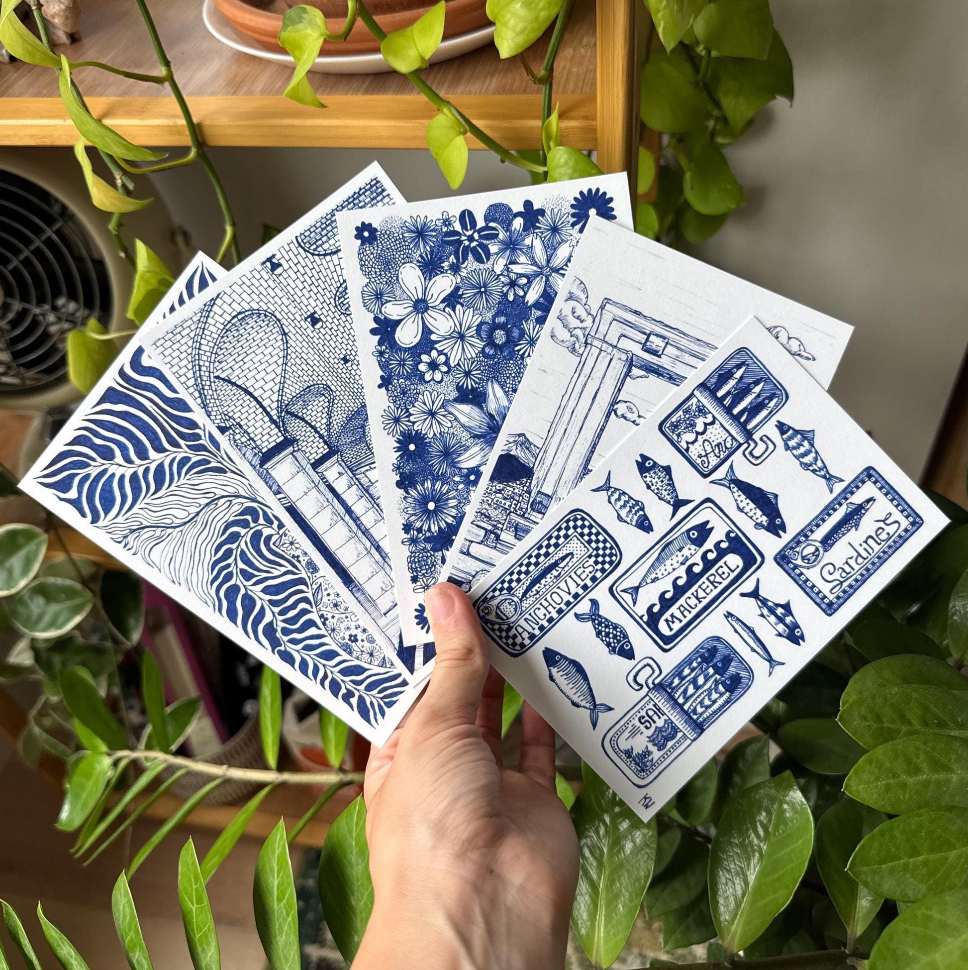 A bundle of five 4x6 prints of blue ink drawings that include: a Flower Vase, Tinned Fish, an NYC Subway Station, a Flower Collage, and Naxos Island from Greece!