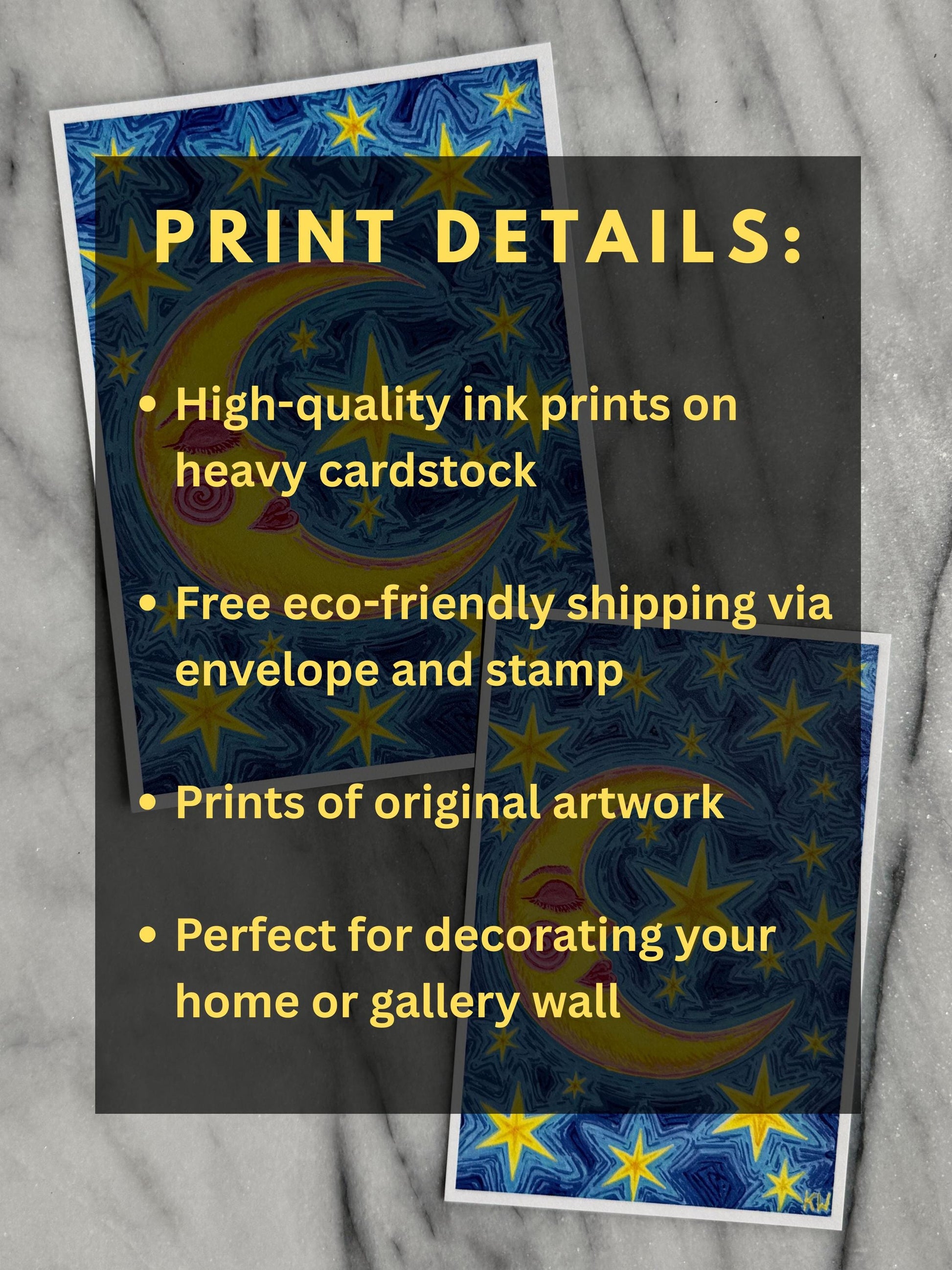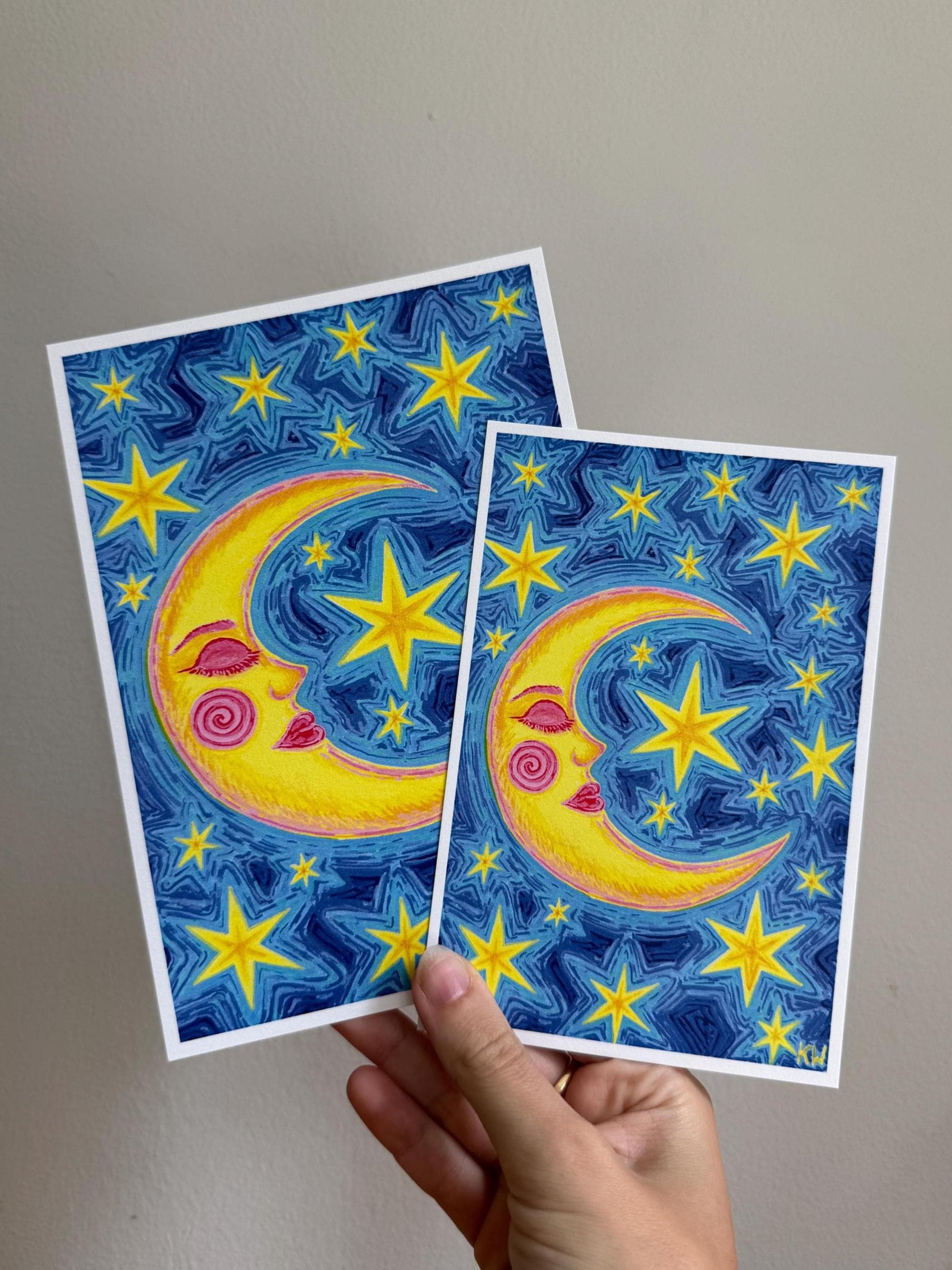 This hand-drawn celestial art print captures the magic and wonder of the night sky, inspired by the dreamy aesthetics of the Luna Luna amusement park.