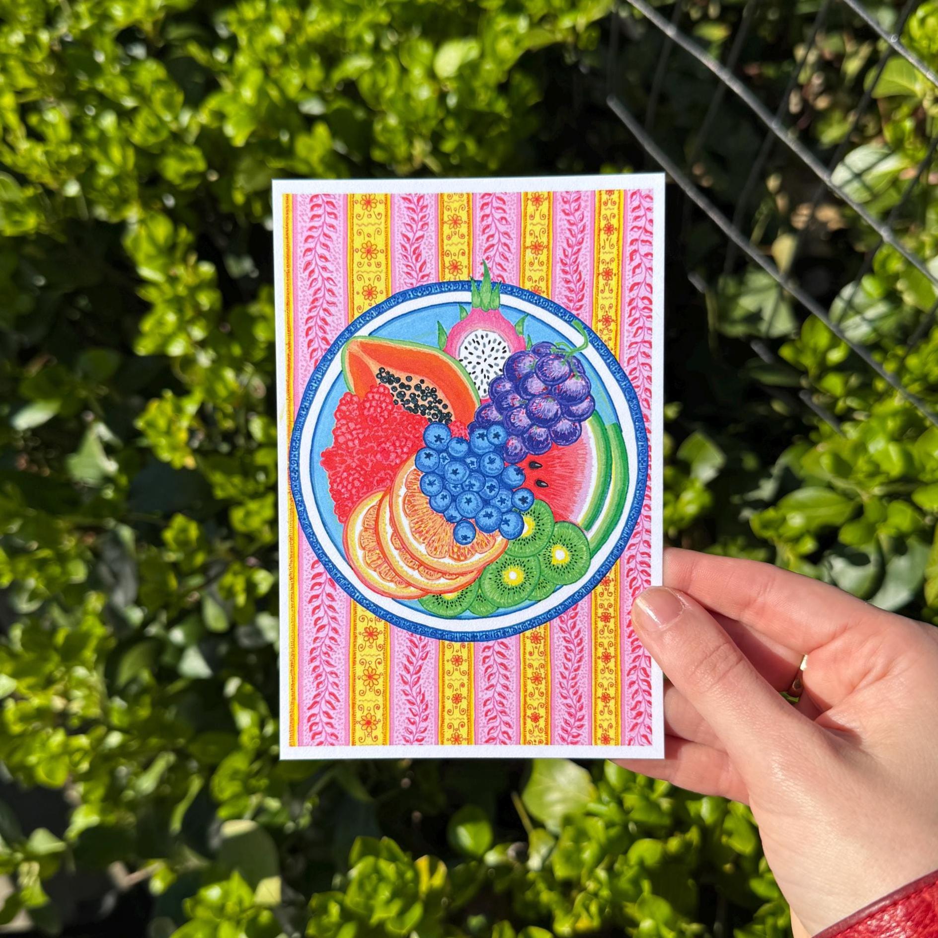This hand-drawn ink and marker illustration celebrates the beauty and vibrancy of fresh fruit! Inspired by my favorite fruits, this artwork features a deliciously colorful arrangement of papaya, blueberries, dragon fruit, kiwi, citrus, and more, set against an intricate patterned background. Perfect for food lovers, home chefs, and anyone who adores bold, joyful art, this 4x6-inch print brings warmth and color to any space. Whether you’re decorating a kitchen, dining area, café, or breakfast nook, this unique piece adds a touch of freshness and vibrancy!