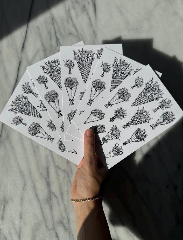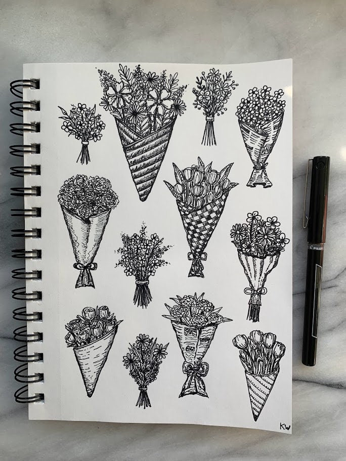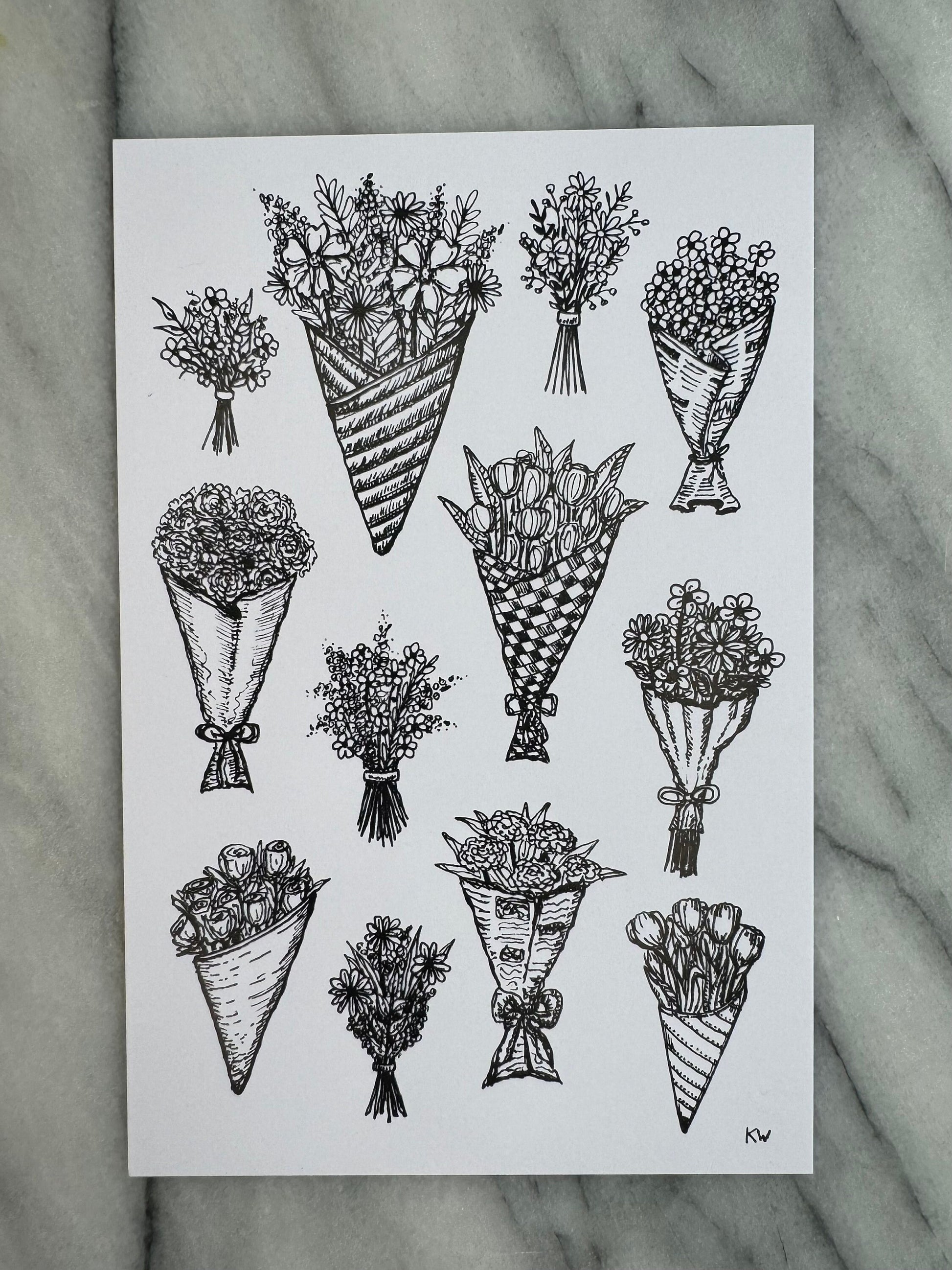 This 4"x6" Flower Bouquet Collage art print is based on an original drawing done in black ink from my sketchbook! This was inspired by all of the floral shops and bodegas with bouquets for sale on the streets of New York.