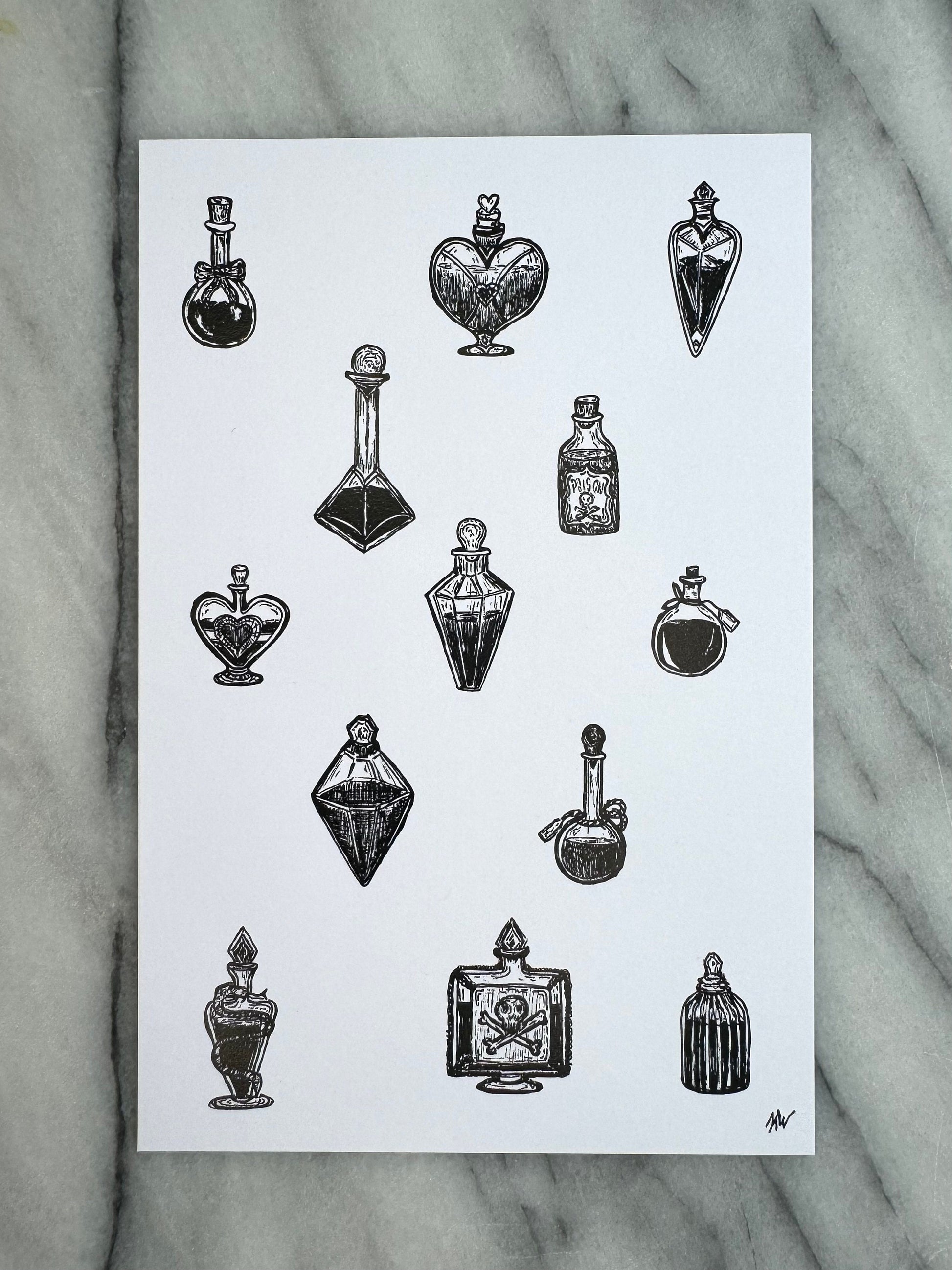 This 4"x6" Magic Potions art print is based on an original drawing done in black ink from my sketchbook!