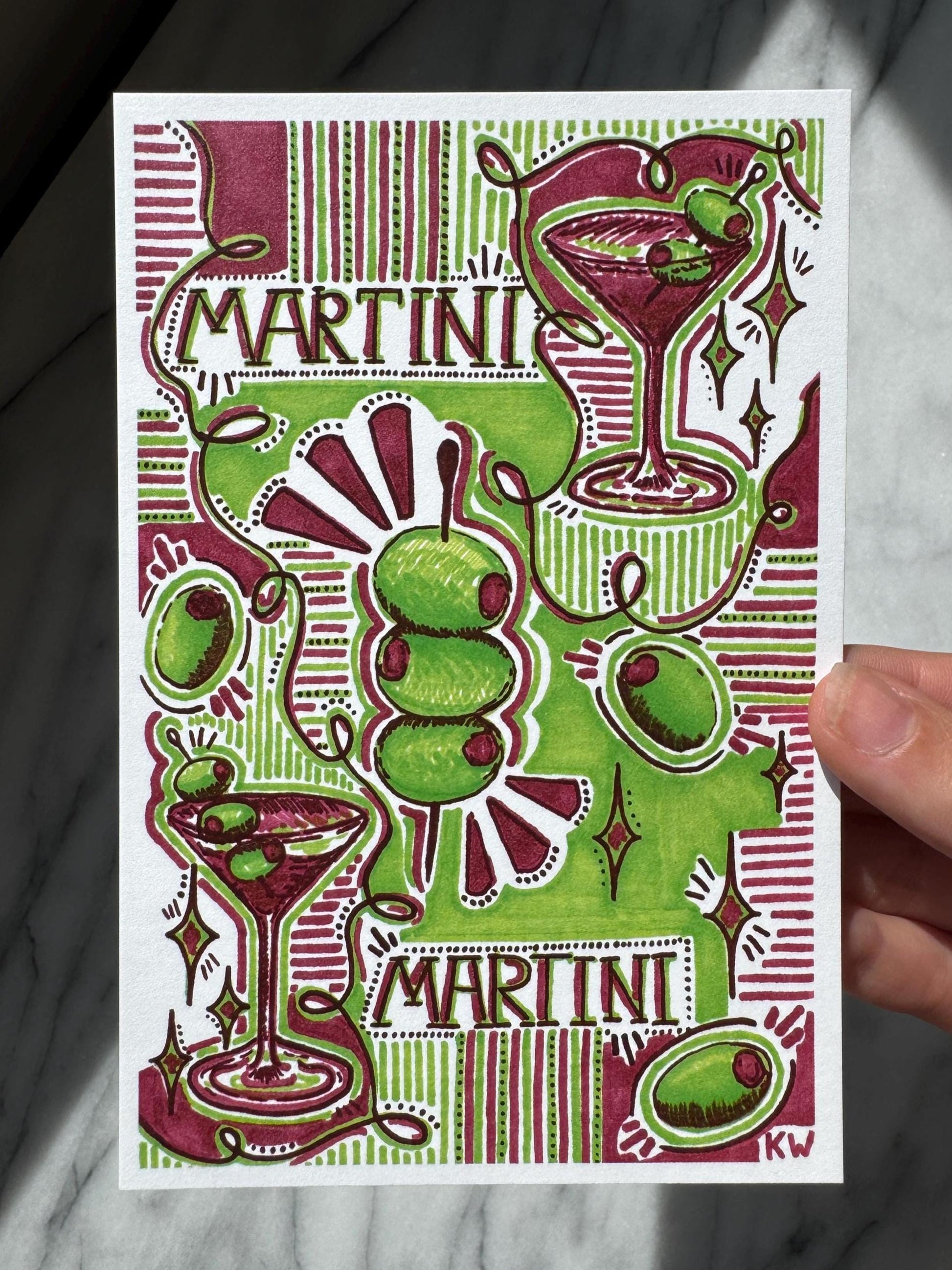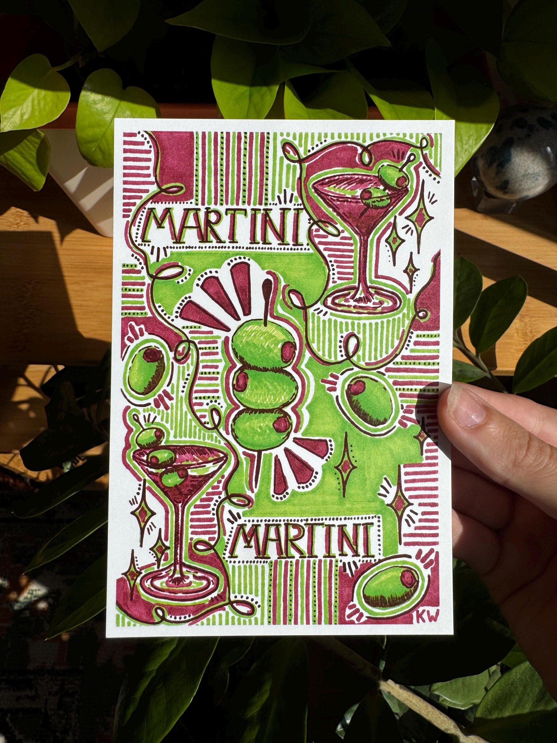 This 4"x6" Martini & Olives art print is based on an original drawing done in both ink and Sharpie from my sketchbook!