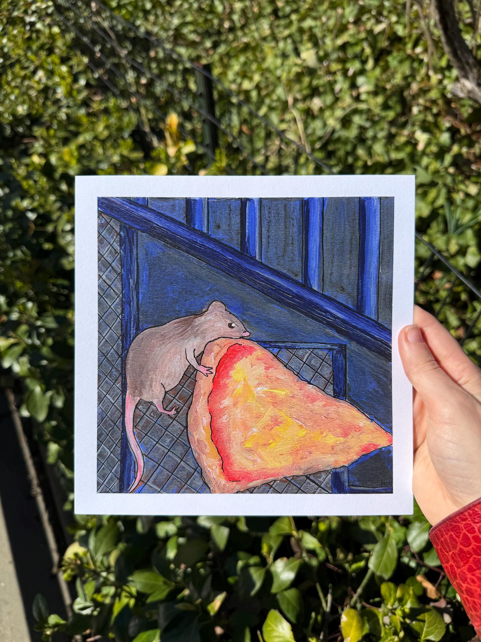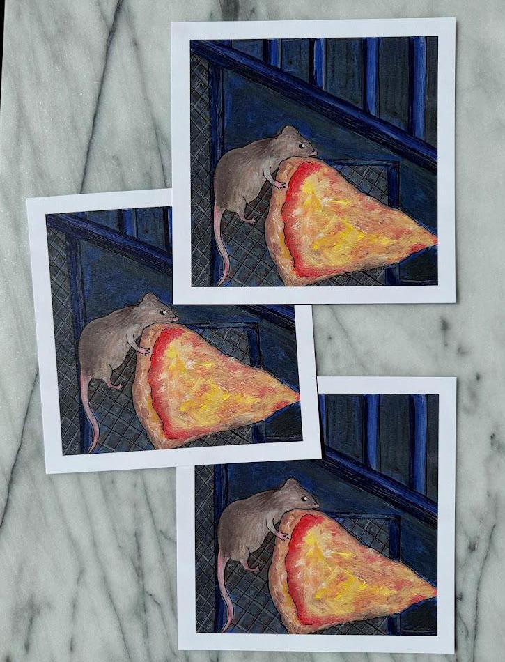 Bring a slice of New York City's quirky charm into your space with "Pizza Rat", an 8x8-inch art print featuring the legendary rat dragging a giant slice of pizza down a subway staircase. Inspired by the famous viral moment that captured hearts everywhere, this playful piece adds humor, character, and a touch of city life to any room!