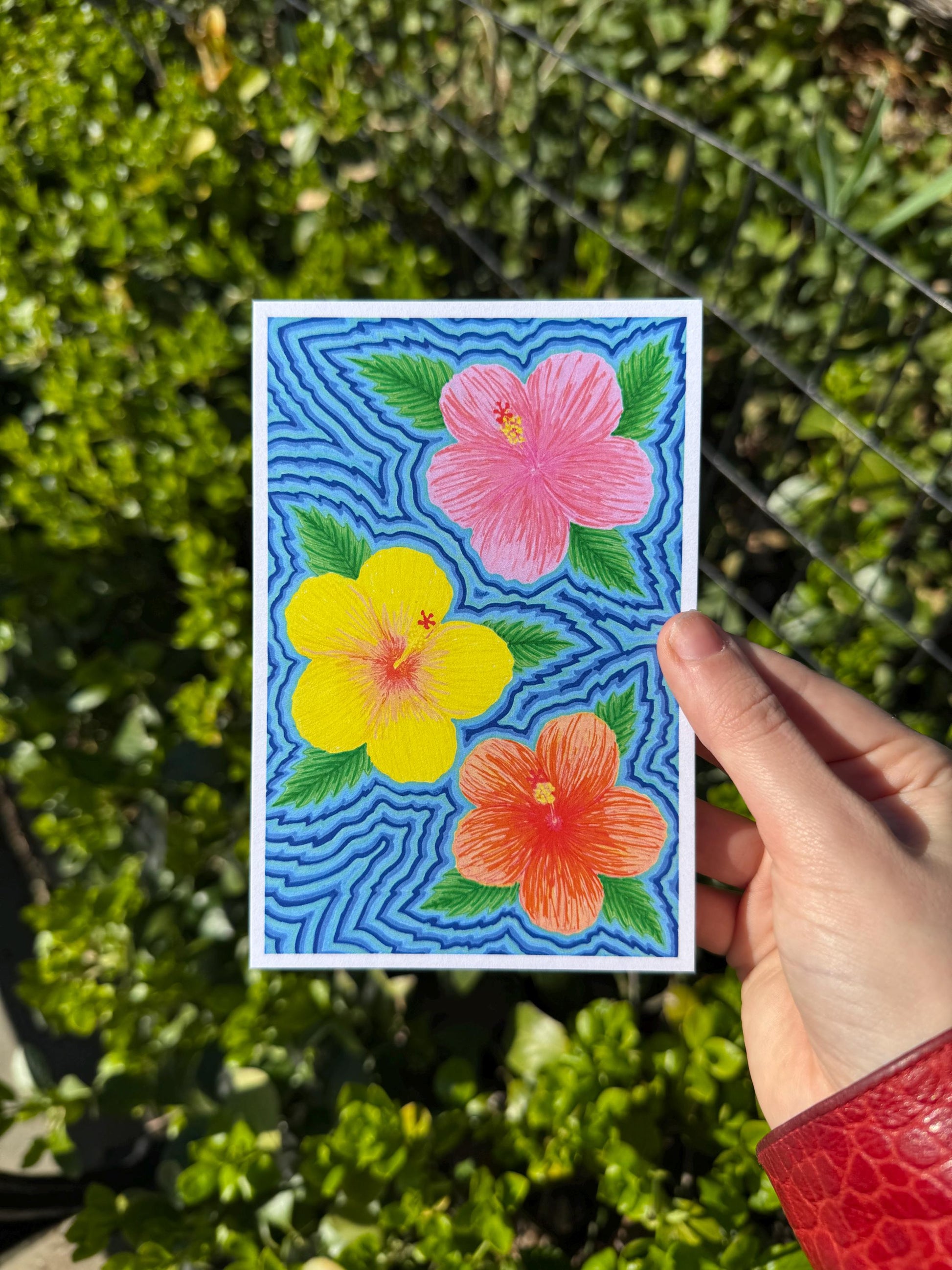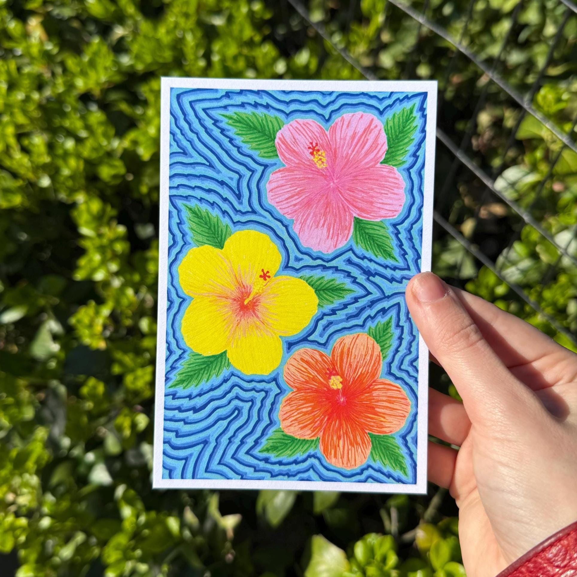Bring a burst of tropical beauty into your home with this vibrant hibiscus 4x6-inch art print! This print features hand-drawn hibiscus flowers in lush shades of pink, yellow, and orange. Inspired by the beautiful shades of Hibiscus flowers in Florida and Hawaii, this piece captures the joy and color of tropical flora.