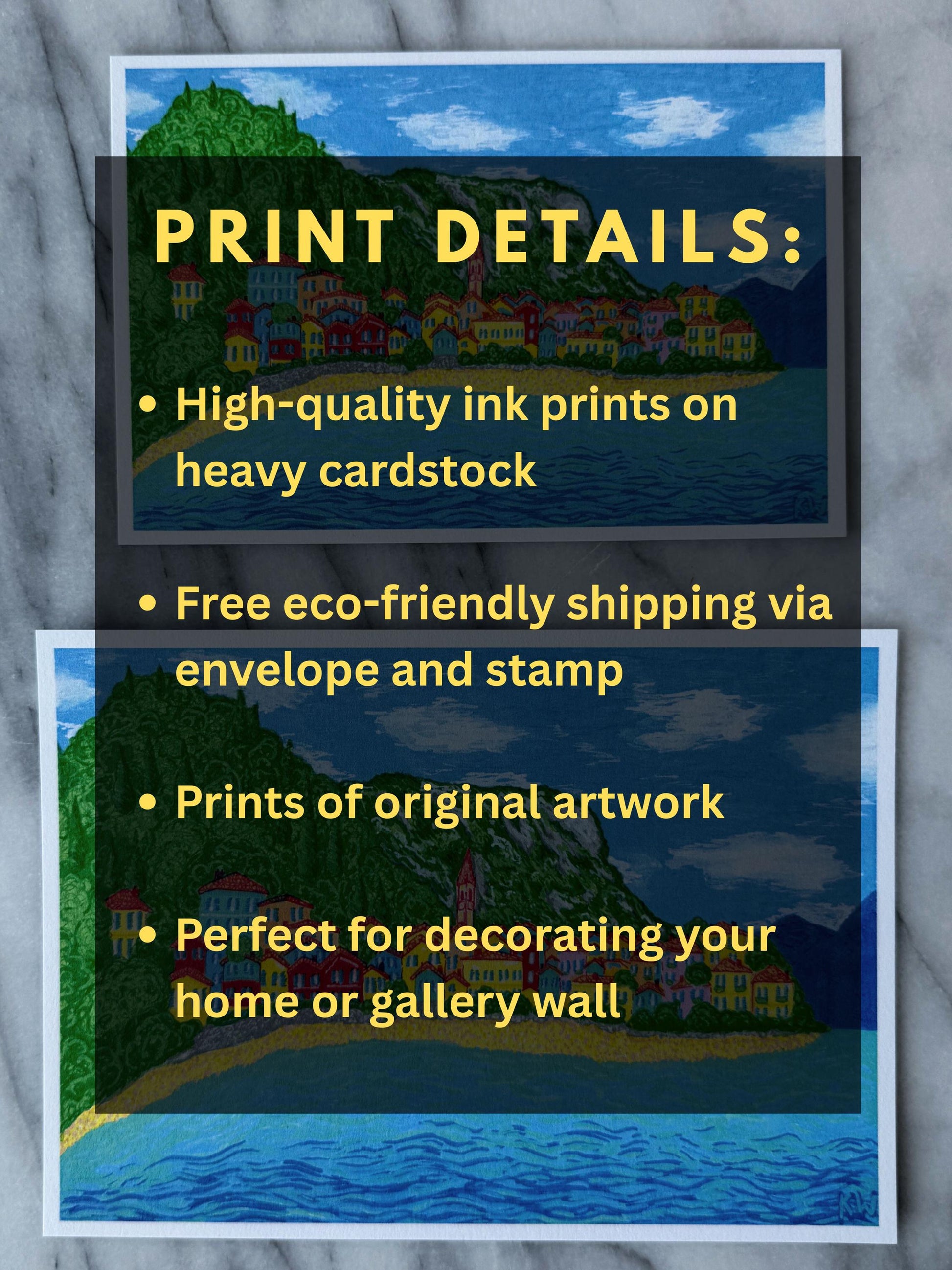 Capture the magic of Lake Como with this vibrant art print of Varenna, a charming lakeside town nestled in the Italian Alps. My trip to Varenna inspired this piece! This drawing features the iconic view from the ferry, colorful buildings stacked against lush green cliffs, and the beautiful blue waters of the lake in the foreground.
